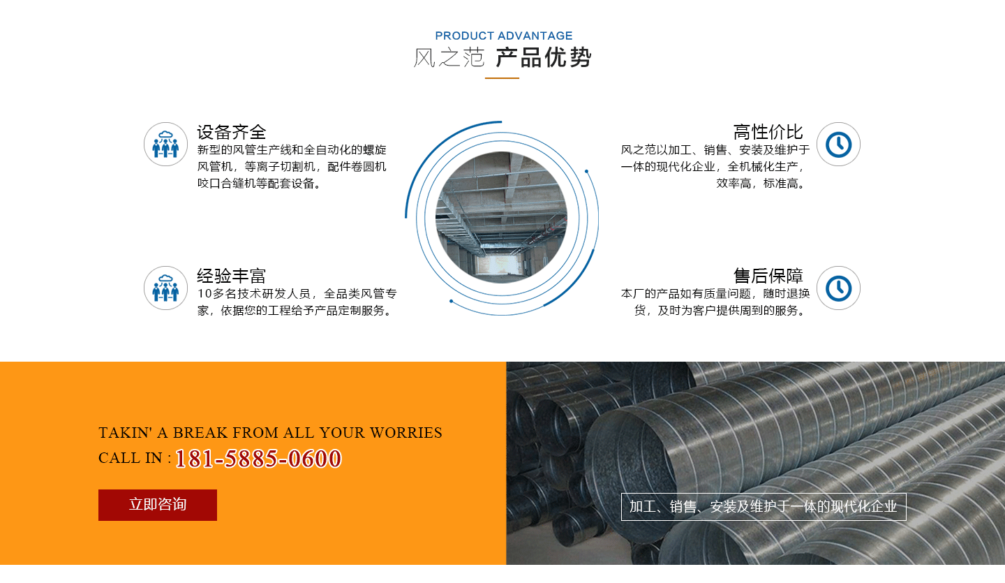 安徽風之范通風設備有限公司,是北京恒通偉業通風設備有限公司再創的新臺階,多年來,公司員工憑著“誠信敬業、團結拼搏、勇于開拓、務實進取”的企業精神,先后承接了多項重點工程項目,使公司健康穩步發展?,F由于公司的壯大,業務的拓展,又于2016年底,成功坐落于安徽省合肥市包河區。本公司生產設備精良,技術力量雄厚,質保體系完善!讓用戶體驗到,貼心的服務,無憂的售后!風之范是以加工、銷售、安裝及維護于一體的現代化企業,同時以“創未來之風、營誠信之范”為核心理念,面向全國各省市,大量生產鍍鋅板、不銹鋼、玻璃鋼、酚醛復合等通風管道、螺旋風管、廚房排煙罩、油煙凈化器、各種風機風柜、風口風閥、靜壓箱等配件設施。廣泛承接商場、工廠、酒店、寫字樓、地下室等,消防排煙工程、除塵凈化工程、室內通風工程、暖通空調工程、廚房排煙凈化工程。我們力求上進,追求,歡迎各界人士技術指導,經濟合作,共創美好明天!